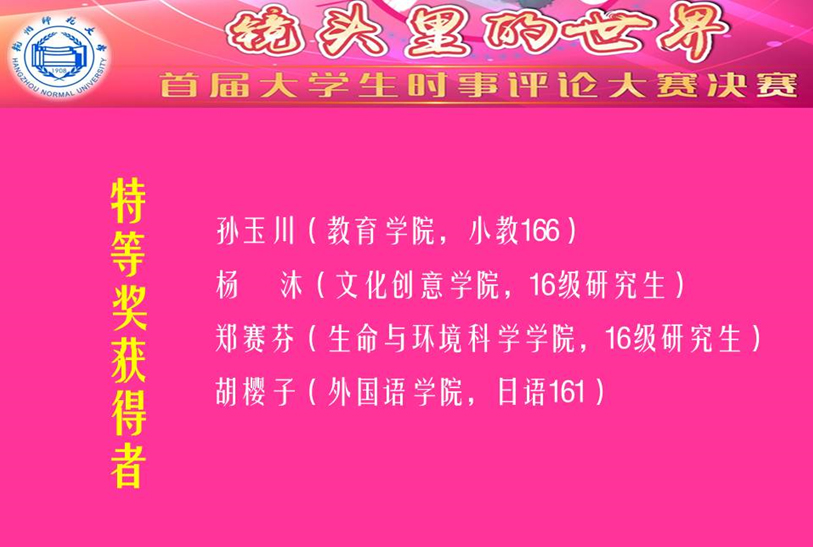 用镜头观社会,以言说抒观点,对照现实生活,体现当代青年责任担当。杭州师范大学建校109周年系列活动之一——首届“镜头里的世界”大学生时事评论大赛,在5月14日下午,于仓前校区恕园7号楼200座剧场举行决赛。全球最大博彩公司排名 2016级生物学学科教育研究生郑赛芬以总分第一的成绩荣获本次大赛特等奖。