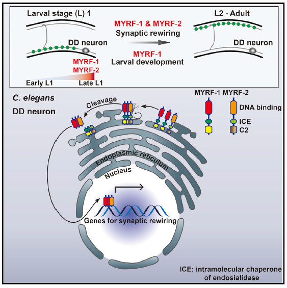 齐瀛川课题组的研究以遗传筛选的方式鉴别到突变体具有突触重塑障碍,并鉴别出该突变是个单点突变,发生在MYRF-1上。进一步的研究发现MYRF-1蛋白全长定位在内质网上,并能发生剪切,之后释放出蛋白的氮端,这个氮端具有结合DNA的功能域,它进入细胞核并参与转录调控,而其氮端在核内的功能恰恰对突触重塑调控最为重要。意想不到的是,这个点突变导致了突触重塑障碍,但是MYRF-1功能缺失突变体却呈现正常的重塑表型,这是因为MYRF-1的同源基因MYRF-2也能促进突触重塑。把MYRF-1和MYRF-2同时用CRISPR技术突变掉后,突触重塑则不能发生。实验表明,MYRF-1点突变不仅失活了自身功能,而且能够抑制MYRF-2的功能。