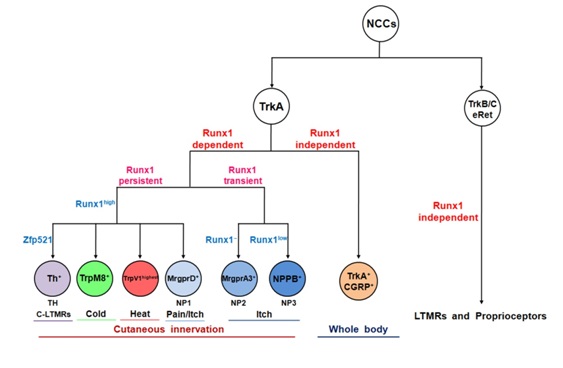 在背根神经节(DRG)细胞中,早期表达神经营养因子受体TrkA的神经元依赖Runx1的持续表达,这些神经元在外周投射于源自外胚层的表皮和毛发。但在成体的DRG中,Runx1和TrkA的表达却互不重叠,原因是在部分Runx1阳性细胞中关闭了TrkA的表达,而在部分TrkA阳性细胞中关闭了Runx1的表达。因此,根据Runx1的表达方式,这些TrkA谱系的感觉神经元可分为Runx1持续表达和Runx1瞬时表达两种类型。在成体DRG中,Runx1持续表达的一组神经元在介导机械性和温度感觉信息的传递中发挥重要作用,另一组瞬时表达Runx1的神经元则在介导痒觉信号传递的过程中起到关键作用。 转录因子Runx1的这种层级调控模式为我们研究不同感觉神经元介导不同感觉形成的机制提供了一种新的模型。