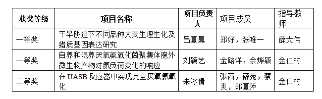在学院精心组织下,推荐了“干旱胁迫下不同品种大麦生理生化及蜡质基因表达研究”等4个项目参加评选。经大赛组委会专家组网络评审,最终我校有3个参赛项目获奖。其中“干旱胁迫下不同品种大麦生理生化及蜡质基因表达研究”和“自养和混养厌氧氨氧化菌聚集体胞外微生物产物对氮负荷变化的响应”2个项目入选创新组一等奖,“在UASB反应器中实现完全厌氧氨氧化”项目获得创新组二等奖。入选一等奖的项目将于今年7月到吉林大学,与来自全国四百多所高校的优秀学子同场竞技争夺特等奖。