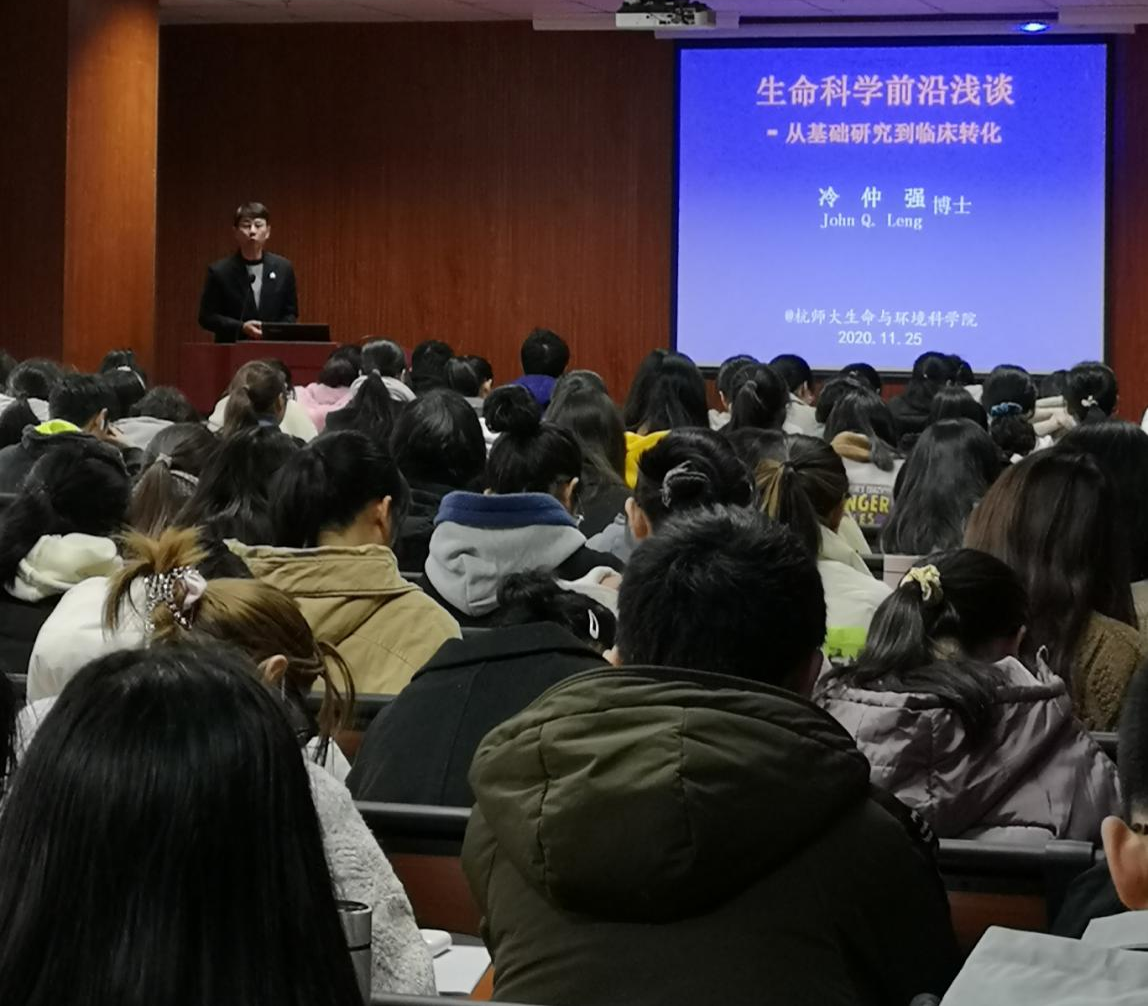 11月25日,来自美国耶鲁大学医学院首席研究员,现任国际企业协会(纽约)副理事长、医学研究中心教授、主任,国际企业协会中国区分会理事长,杭州哈鲁生物科技股份有限公司董事长冷仲强,应邀来全球最大博彩公司排名 为2020级本科生做主题为“从基础研究到临床应用”的讲座。冷仲强博士从曾在耶鲁大学医学院参与的细胞与分子生理领域研究的经验出发,介绍了生命科学的国内外发展现况及未来发展趋势。并结合自身在该领域丰富的科研经历,详细讲述了从基础研究到临床应用的过程,拓展了学生的视野及进一步提升了学生对生命科学领域学习的积极性。冷仲强博士以自身经历还多次勉励同学们要努力拼搏抓住机遇。学生们学习兴趣浓厚,并与冷仲強博士就生物专业就业方向、多学科交叉优势、干细胞治疗等话题作了深入讨论。