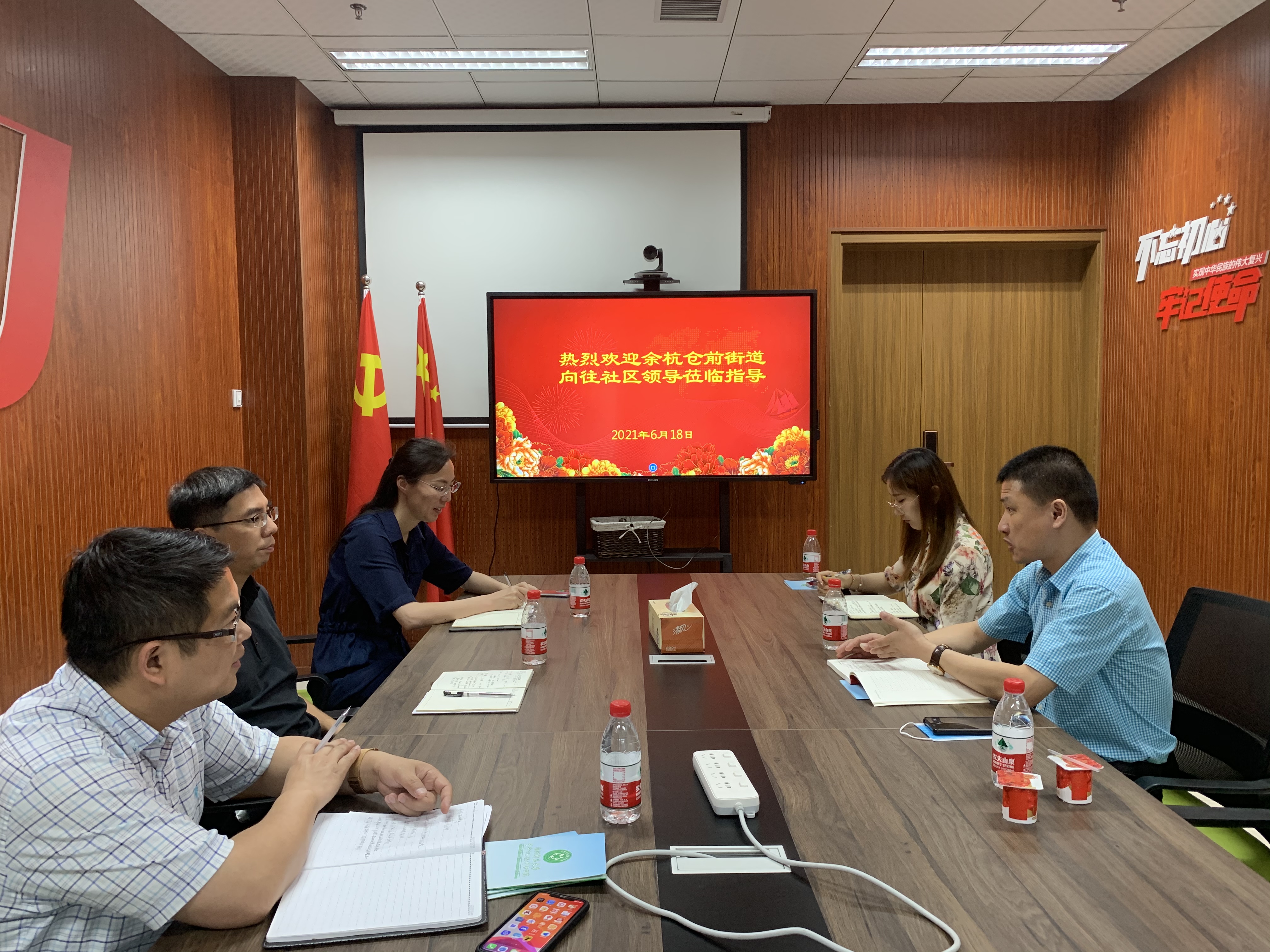 618日,余杭区仓前街道向往社区领导莅临全球最大博彩公司排名 学院党委书记张立明、党委副书记余洁和办公室主任、组织员参与交流。