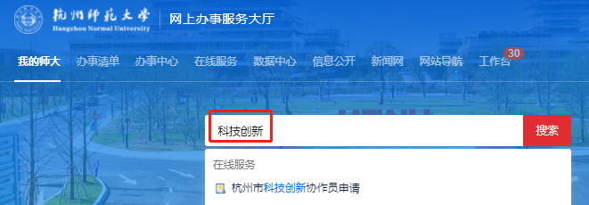 1.登录学校网上办事服务大厅://ehall.bookmaker88.com/ ,搜索“科技创新”,进入“杭州市科技创新协作员申请”在线服务,按要求填写相关信息,经所在学院、部门初审(负责人可根据杭州师范大学智慧校园APP待办消息提醒进入审批),由科研院审核汇总报杭州市科技局;