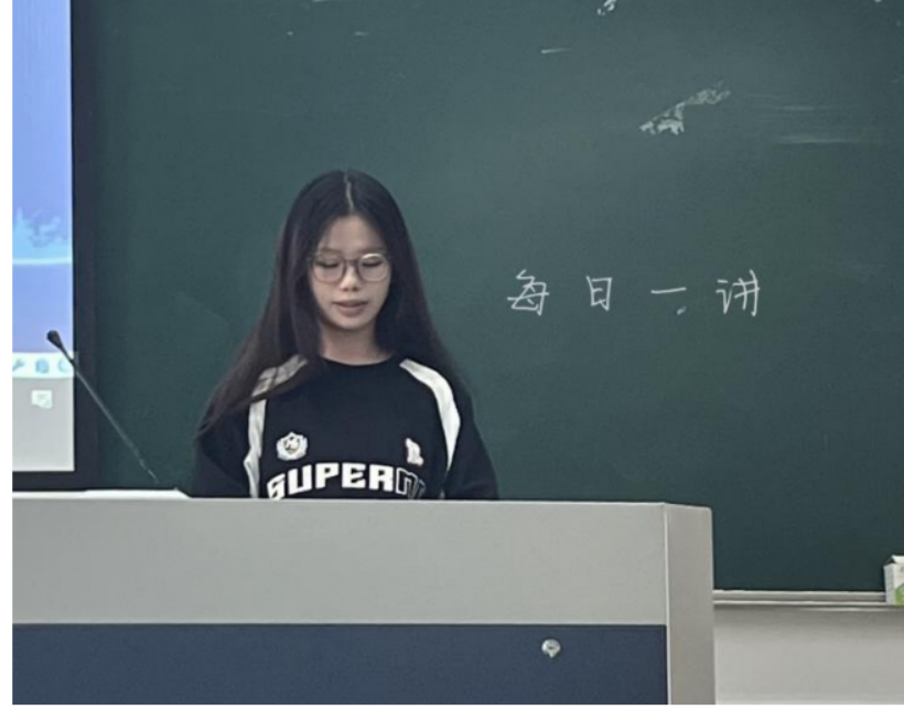 2024年04月25号,环工211班如常开展了每日一讲的活动,宋明月同学利用课余几分钟,进行了题为《青春力量筑梦想,奋斗青春谱华章》的演讲。声情并茂的讲述,感染了在场的每一位同学们。
