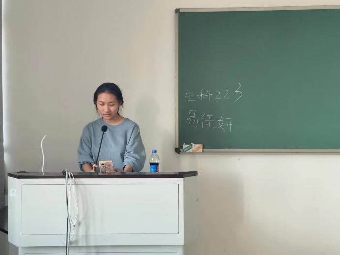《师说》云:“师者,所以传道受业,解惑也。”教师是学生通往知识道路上的引路人,教师不但承担教授学生知识,也引导学生的身心发展。教师的劳动特点是复杂的,教师不能只做知识的搬运者,亦要为学生做出表率,促进学生健康成长。为了让同学们意识到教师不能只做教书匠,要成为大先生,做学生为学,为事,为人的示范,促进学生成长为全面发展的人。在慎1-204教室,生科223班的易佳妍同学进行了以“不做教书匠,愿为大先生”为主题的演讲。